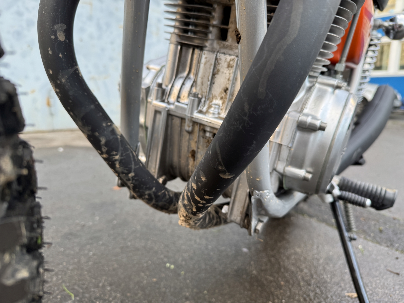 24.11.2024 - Die Temperaturen sind ungewöhnlich mild für Ende November, zudem ist es trocken. Ich suche mir in der Garage ein paar Ersatzteile (Zündkerzen, Kabel, Sicherungen), Werkzeug und jede Menge Mut zusammen und starte zu einer etwas längeren Probefahrt. Die Honda ist soweit brav, ich muss unterwegs den Kupplungszug nachstellen und das Standgas etwas höher drehen, aber bei mehreren Stopps ist kein Öltropfen unter dem Motor zu sehen. Fahren lässt sie sich ganz gut, das Mopped ist leicht und wendig, aber aufgrund der kurzen Geländeübersetzung nichts für Autobahnetappen: bei 50 km/h liegen im 5. Gang bereits knapp 3400 U/min an, zudem sind die 33 PS nicht gerade üppig. Nach- dem ich die gewaltige Strecke von fast 50 km absolviert habe, kommt so etwas wie leichte Entspannung auf . ob die Probleme nun der Vergangenheit angehören? Ich bleibe skeptisch, man wird sehen. 07.12.2024 - Heute ein etwas anderer Bericht, nicht von der Schrauberfront: Weil ich die Honda mit aller gebotenen Vorsicht als "Fertig" deklariert habe, melde ich mich bei einem Redakteur der Zeitschrift "Oldtimer Praxis" - dem hatte ich die Story schon vor einem Jahr zugesagt hatte, aber aus den hier bereits mehrfach niedergeschriebenen Gründen diese Zusage nicht habe einhalten können. Der ist sofort dabei und will mir in den nächsten Wochen einen Fotografen vorbei schicken - der hat aber ein schmales Wetterhoch in Bonn für heute ausgemacht und kommt vorbei. Meine Schwester wird engagiert, sie soll den Wagen des Fotografen fahren, während der - im Kofferraum sitzend, mich und das Mopped im Fahren ablichten wird. Es ist nass auf den Strassen, der Fotograf legt sich mächtig ins Zeug und überredet mich sogar, meine schöne Maschine im "Enduro-Style" über eine Wiese zu fahren, sprich: Im Matsch, mit mir auf den Rasten stehend. Die Honda hat ordentlich Dreck abgekriegt, hoffentlich sind die Fotos was geworden! Immerhin spielt das Wetter mit - nächste Woche soll es deutlich kälter werden und sogar Schnee ist möglich. Der Tag ist damit gelaufen, erst gegen 17:00 sind wir zurück, hat aber Spass gemacht. Der Bericht wird vermutlich in der Februar oder März Ausgabe erscheinen, ich bin gespannt!