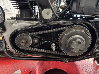 07.10.2025 - Ich reinige die beiden Prmärdeckelhälften so gut es geht, dann wird frisches Baumarktsilikon auf die dicke Gummidichtung geschmiert, der Deckel fixiert und zusammengesetzt. Das muß jetzt erstmal ein paar Tage trocknen, bevor ich Öl in den Primärtrieb füllen kann. Linke Fußraste dran, das Bremspedal wieder anbauen und mehr geht erstmal nicht, ich helfe Dieter bei der Inspektion der CB250.