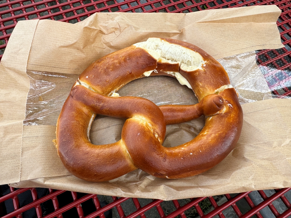 kurz vor Ulm eine Butterbrezel. Ich fahre etwas flotter als sonst,