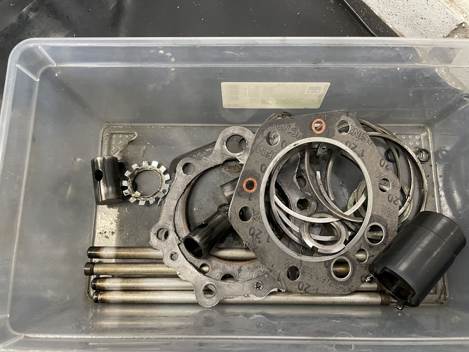 27.03.2023 - Nach der Dienstreise geht es weiter, ich setze die Nockenwelle gut geölt wieder ins Motorgehäuse und befestige sie mit dem Flansch. Es folgen die neuen Tassenstößel, die deutlich strammer sitzen als meine Altteile. Dann demontiere ich die alten Kolbenringe und setze neue auf. Mit einem passend bestellten Kolbenringspannband (meines war zu klein) setze ich die Kolben in die Zylinder, neue Fußdichtungen und O-Ringe folgen. Die Zylinder werden auf's Gehäuse gesetzt und die Kolbenbolzen durchgesteckt, dann die Sicherungs- ringe eingebaut - Damit ist das Tageswerk getan.