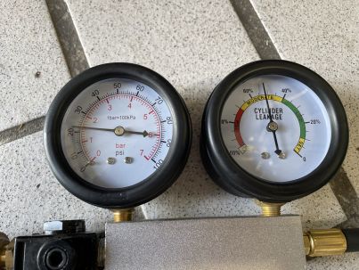 22.07.2023 - Die beiden schön angefertigten Teile passen nicht! Ich komme mit den Gehäusen an den Benzinhähnen nicht vorbei... Die Enttäuschung vor ein paar Tages war gross, aber es ist nicht zu ändern. Ich baute alles wieder ab und setzte stattdessen Gaszugbögen mit einem kleineren Winkel ein (gibt's mit 90 Grad, 60 und 45) und setzte alles wieder zusammen. Die Guzzi sprang nur mühsam an und lief im Stand nur auf dem rechten Zylinder, was ist nun schon wieder? Schwimmer- stand OK, Benzin kam an, Zündfunke ist da. Watt nu? Da der Vergaser schon lange herumzickt, entschied ich mich für eine Radikalkur, wohl wissend, das es für mich als Schrauber eigentlich eine Bankrotterklärung ist: Ich bestellte für 360 Euro einen komplett neuen Vergaser! Der kam heute an und ich gehe Richtung Garage. Der alte Vergaser ist schnell abgebaut, der neue schnell montiert. Sprit kommt an, also Startversuch. Aber die Guzzi springt wieder kaum an und läuft nur noch auf dem rechten Topf. Ich kontrolliere noch einmal auf beiden Seiten das Ventilspiel und prüfe die Kompression: Zu meinem Entsetzen sind rechts nur knapp 3 Bar, links Null!!! Zuerst habe ich den Kompressionsschreiber in Verdacht, aber der ist in Ordnung. Druckverlusttester ranholen, Kerzen raus, Kolben auf OT: Rechts pfeift's ins Kurbelgehäuse, links aus dem Auslaß, Ergebnis: rechts Zylinder, Kolben und / oder Kolbenringe defekt, links Außlassventil vermutlich verbrannt. Ich fasse es nicht... Frustriert packe ich alles Werkzeug wieder weg, ich muß nachdenken, was nun zu tun ist: Motor komplett gegen ein Gebrauchtteil ersetzen? Neue Zylinder und Kolben kaufen, Köpfe nochmals instandsetzen lassen? Maschine mit Riesen-Wertverlust verscherbeln?
