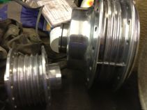 10.03.2013 - Der 2. Schleifdurchgang ist deutlich anstrengender als der 1., das feine 1200er Schleifpapier soll die gröberen Kratzer des Vorschliffs beseitigen, was bedeutet: Schleifen, schleifen und nochmals schleifen... Bevor die Finger bluten, höre ich auf - besser wird's nicht mehr. Dann baue ich meine kleine Poliermaschine auf und entscheide mich angesichts der schmalen Kühlrippen der Bremstrommeln für ebenso schmale Polierscheiben. Das verringert nun zwar auch den benötigten Kraftaufwand für die Maschine und mich, dafür dauert's länger. Nach dem Vorpolieren mit grober Scheibe und ebenso grober Schleifpaste ist die Maschine heißgelaufen und benötigt eine Pause - ich aber auch... ;-) Nach einer halben Stunde Abkühlung geht es mit dem Hochglanzpolieren weiter, danach sehen die Naben recht ordentlich aus. Der Bastelkeller sieht nach den Aktionen gestern und heute aus wie ein Schweinestall, es wird gefegt und gesaugt. Zu mehr habe ich heute aber keine Lust mehr, den Rest des Sonntags nehme ich mir frei...