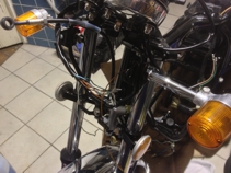 27.07.2013 - Vor einer Woche hatte ich, mangels Neuteilen, zwei vordere Blinkerhalter zum Verchromen weggegeben, die sind bereits gestern fertig geworden und werden heute flugs montiert - aber vorher werden sie innen noch mit Rostumwandler und Grundierung eingepinselt. Die Blinker folgen gleich, dann setze ich mit den in der Woche ange- kommenen Neuteilen die vordere Bremse endgültig zusammen. Der Bremsdruckverteiler wird mit dem neuen Bremslichtschalter versehen und am Lampenhalter montiert, dann kommen die neuen Stahlflex- Bremsleitungen an ihren Platz. Dem Hauptbremszylinder fehlte noch die untere Abdeckplatte sowie der Gummidämpfer des Bremshebels, damit ist auch dieses Teil montagefertig. Das neue Blinkrelais nimmt mitsamt Gummihalter seinen Platz am Batterieträger ein, danach mache ich mich über den vorderen Scheinwerfer her: Der Chromring braucht nur eine Politur, der Reflektor dagegen muss am Rand entrostet werden. Der Lampentopf weilt unterdessen bereits seit einigen Tagen beim Lackierer, das war mir selbst zu heikel (wegen des Kunststoffs). Dann sehe ich mir die diversen Lenkerschalter ein, einiges davon ist brauch- bar, einiges anderes eher weniger. Die brauchbaren Teile werden mit Rostlöser eingeprüht, in den nächsten Tagen kümmere ich mich weiter darum. Sorgen macht mir ein verchromtes Blechteil, das, an den Lenkerklemmen befestigt, als Führung für die Seilzüge dient. Dieses Teil fehlt praktisch immer, auch an meiner Maschine. Leider gibt's das neu nicht mehr, der einzige Anbieter in den USA will satte 31 $ plus Versand haben, ich werde wohl in den sauren Apfel beißen müssen, da die Bauform nicht ganz einfach ist. Die fehlenden hinteren Fußrastenträger dagegen werde ich aus 3 mm starkem Edelstahl- blech selbst herstellen.