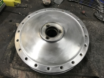 25.11.2018 - Ich muß mich um etwas kümmern, das ich selbst versäumt habe: die hunderte von kleinen Tütchen mit Ersatzteilen müssen beschriftet werden, damit ich die O-Ringe, Dichtungen, Gummitüllen usw. zuordnen kann - das werde ich zukünftig sofort bei Ankunft der Teile machen, nachdem ich über eine Stunde mit Hilfe des Teilekatalogs und des Internet endlich alle Brocken identifiziert und beschriftet habe. Eine weitere Maßnahme ist ebenfalls unumgänglich: Aufräumen und Staubsaugen! Der Industriesauger müht sich redlich, den Staub vom Boden und die Späne vom gestrigen Fräsen in seinen gefrässigen Schlund zu saugen, bis das Chaos wieder etwas kleiner wird. Mein gestern ruinierter Schraubendreher wird am Schleifbock wieder leidlich in Form gebracht, dann reinige ich die hintere Radnabe und beginne mit dem Vorschleifen. Das war's aber auch für heute, ich will nicht auch noch den ganzen Sonntag im Arbeitsanzug verbringen. 26.11.2018 - Etwas Zeit habe ich, widmen wir uns meiner "Lieblingsbeschäftigung": Schleifen... Die Hinterradnabe wird noch einmal grob und dann fein geschliffen, die Vorderradnabe bekommt ebenfalls noch einen Feinschliff. Im Internet suche ich weiter nach einer neuen Vorderradfelge, aber es ist nichts zu bekommen. Es gibt allerdings neue Felgen für Fahrzeuge mit Scheibenbremse, nur sind da die Naben deutlich kleiner, daher prüfe ich mit der alten Felge und 2 Speichen, wie viel "Luft" ist, um die Speichen schräger zu stellen - viel Luft ist nicht, nur etwa 2-3cm. Das bedeutet, das eine Felge für eine 180mm Nabe passen würde, kleiner darf es nicht sein, oder die Speichen passen nicht mehr in die Felge. Ich suche weiter...