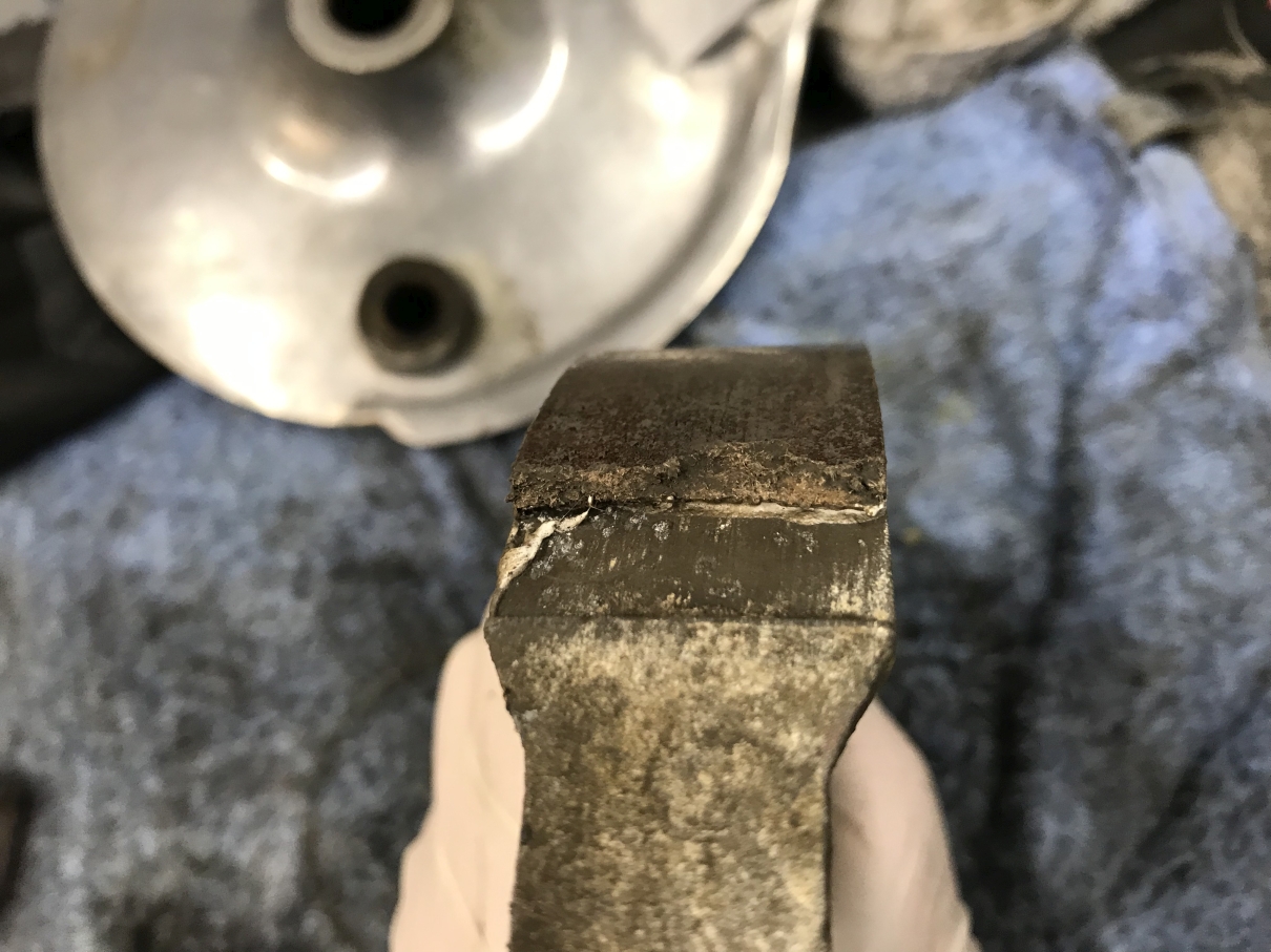 02.12.2018 - Die Bremsen stehen auf dem Programm, die Bremsankerplatten werden überprüft, die Backen demontiert und alle Teile gereinigt. Um die Bremsen hat sich schon lange niemand mehr richtig gekümmert: Die Beläge haben zwar noch ordentlich "Fleisch", aber teilweise löst sich der Belag schon vom Träger ab... Die vorderen Bremshebel sind vom Chrom her schlechter als befürchtet, die müssen mangels Neuteilen auch verchromt werden, aber wie macht man die auseinander? Nach eingehender Betrachtung steht fest, das die Teile mit einer Art Niet verpresst sind, mit vorsichtigen Anschleifen dessen Rückseite, mit Hilfe einer Nuß und dem Schraubstock als Presse bekomme ich die Niete schließlich aus den Teilen, damit können die neu verchromt werden. Befestigen werde ich wieder mit einer selbst hergestellten Schraube mit knapper Passung, von der Rückseite werden Muttern mit flüssiger Schraubensicherung die Teile zusammenhalten. Aber für heute ist's genug mit der Arbeit.