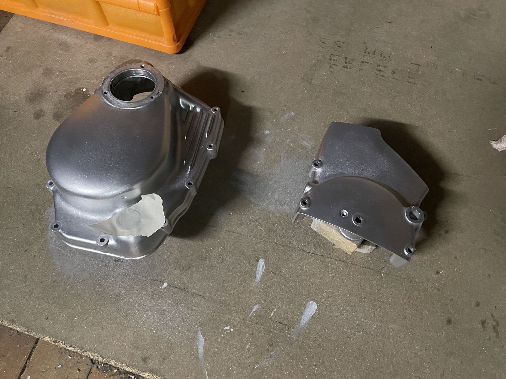 07.11.2022 - Viel kann ich derzeit nicht machen, bevor die Motordichtungen und die noch fehlenden Teile zur Befestigung der Armaturen an Land kommen. Aus der Garage hole ich mir den Kupplungsdeckel, an dem habe ich noch eine Stelle ent- deckt, wo das Alu durch den Lack durchschimmert. Diesen und den vergessenen Ritzeldeckel lackiere ich silbern, das war's für die Honda heute.