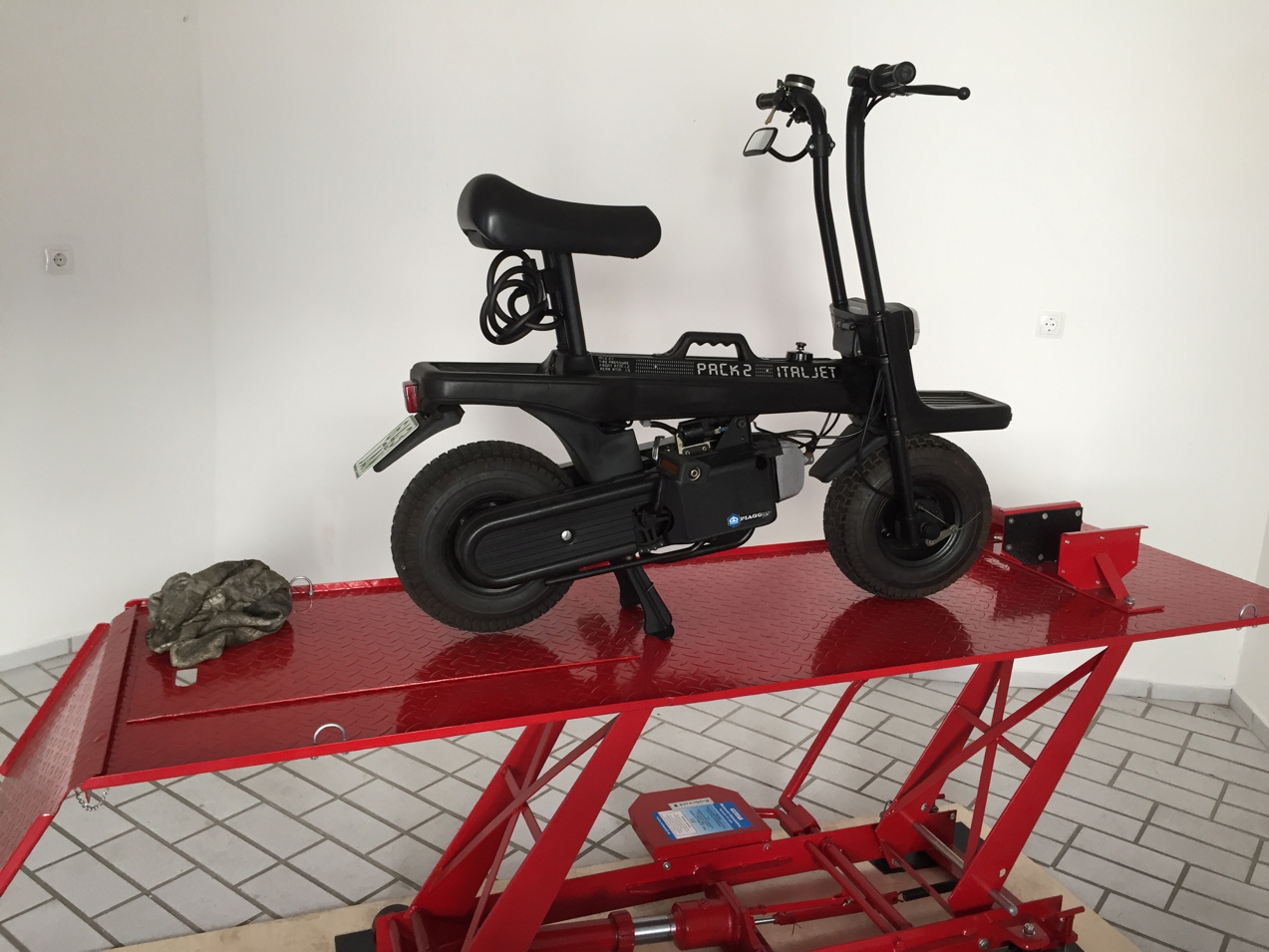 07.07.2016 - Zwischendurch musste ich noch einmal die Düse reinigen - der Spritfilter kommt seiner Funktion nicht richtig nach, daher bestelle ich mir ein anderes Modell mit Papiereinsatz statt mit Netzfilter. Zudem scheint mir die 43er Hauptdüse etwas knapp bemessen, beim Beschleunigen ruckelt der Motor immer wieder. Als Abhilfe soll ein Satz Düsen in verschiedenen Größen herhalten, der geordert wurde und bereits da ist - am Wochenende werde ich's ausprobieren. 09.07.2016 - Es gibt Probleme mit der Lieferung der Papierbenzinfilter - der Paketdienst schafft es nicht, das Päckchen beim Depot abzuliefern, ich bin 3 x hin, aber trotz Benachrichtigung, dass das Päckchen dort sein solle, ist nichts da... So muß ich mich mit dem Düsensatz begnügen, der von einem anderen Paketdienst problemlos zugestellt wurde. Ich ersetze die 43er Hauptdüse gegen eine 48er, der Motor dankt es mit deutlich besserem Ansprechverhalten. 13.08.2016 - Eine kurze Fahrt zum Autozubehör - prompt bleibt die Italjet wieder mal stehen... Ich schiebe das Mofa bis zum Händler, kaufe die not- wendigen Teile ein und bitte ihn um einen Schraubendreher, um die Schwimmer- kammer abzubauen un die Düse zu reinigen. Aber die Düse ist frei... Ich schiebe das Teil wieder zurück, auf dem Weg liegt noch ein kleiner Mopped- händler, den ich nach einem Kerzenstecker frage. Den hat er zwar, aber er wirft auch selbst mal einen Blick auf das Problem. Nachdem er 2 der 3 Luft- einlässe des Luftfilters verschlossen hat und den Choke betätigt, springt der Motor tatsächlich wieder an! Mit einem Stück Klebeband auf dem Luftfilter schaffe ich es mit Ach und Krach wieder in die Garage. Nachdem die Düse als Übeltäter ausscheidet, bleibt nur der Schwimmer bzw. das Nadelventil, die Teile sind aus Kunststoff und haben sich vermutlich verzogen. Angesichts der äußerst angespannten Ersatzteillage werde ich gar nicht erst versuchen, nach den Teilen zu suchen, sondern den Vergaser komplett tauschen - der ist nämlich im Internet dank baugleicher Vespa Technik erhältlich. 21.08.2016 - Der Vergaser ist vor ein paar Tagen angekommen, am Samstag habe ich Zeit für den Umbau. Die Kleine darf dazu auch mal auf die neue Hebe- bühne, dann komme ich besser an alle Teile heran. Zuerst werden die beiden Seitendeckel demontiert, dann die 3 Halteschrauben des Motors gelöst sowie die Halteschraube des Auspuffs am Rahmen, dann kann der Motor soweit nach vorne geschoben werden, das nach hinten genug Platz für den Ausbau des Vergasers ist. Luftflter weg, den Spritschlauch ab, dann den Vergaser vom Flansch lösen und nach hinten und oben ausbauen. Obwohl im neuen Vergaser eigentlich die richtige 43er Hauptdüse ist, setze ich doch lieber die 46er aus dem alten Vergaser ein. Dann den Gaszug aus dem Gasschieber herausfriemeln und in den neuen Deckel nebst Schieber einhängen, Vergaser einbauen, festziehen und den Luftfilter wieder drauf. Dann Motor wieder nach hinten, den Keilriemen auflegen, spannen und mit den Motorhalte- schrauben filxieren. Ich ersetze noch den etwas knappen Benzinschlauch durch ein längeres Stück und rolle das Mofa zwecks Probefahrt und Leerlaufjustage von der Bühne. Schieben, schieben und nochmals schieben - nichts rührt sich... Wieder auf die Bühne mit dem Ding! Schwimmerkammer ab und: Die Schwimmerkammer ist trocken und riecht noch nach Plastik statt nach Benzin. Benzin auf - kein Sprit... Was ist denn da los? Ich ziehe den Benzinschlauch vom Benzinhahn ab und öffne ihn erneut - der Sprit fließt. Hmmhh... Wo liegt das Problem? Eine Theorie formt sich in meinen Hirnwindungen: Der Benzinfilter liegt relativ waagerecht unter dem Tank, da der Tank eher lang als tief ist, ist der Benzindruck nicht sehr hoch. Eventuell reicht der Druck nicht, daß das Benzin im Filter über die Kante steigt. Ein kurzer Test - das ist das Problem. Halte ich den Benzinfilter senkrecht, fließt das Benzin, halte ich ihn waagerecht,tut sich nichts. Also: Spritfilter raus, Benzinschlauch nochmal ersetzen und testen. Endlich läuft der Motor wieder! Eine kurze Probefahrt, dabei wird der Leerlauf noch eingestellt, dann geht's zurück in die Garage. Nochmal auf die Bühne, die Seitendeckel werden montiert und zu guter Letzt der wackelige Quetschverbinder der Zündspule gegen einen besseren ersetzt. Das einzige, was jetzt fehlt, ist ein neuer Keilriemen, der alte Riemen fängt langsam an auszufransen.