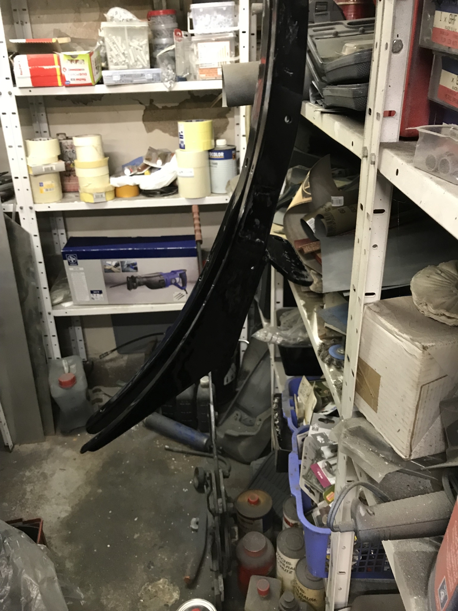 15.05.2018 - In den letzten Tagen habe ich den Kotflügelhalter, der an beiden Seiten gerissen ist, geschweisst und lackiert (nicht besonders gut...), heute soll er, mitsamt Kotflügel und vorderem Nummernschild, wieder ans Mopped montiert werden. Aber der Kotflügel ist unhandlich und die winzigen Schrauben zierlich, da brauche ich mehr als 2 Hände - 2 weitere Hände (Hallo, Dieter!) helfen am Abend aus. Ich habe die Schweissnähte am inneren Teil des Halters nicht glatt geschliffen, um die Stabilität nicht zu beeinträchtigen, aber dadurch passt die Befestigungsschraube nicht mehr dazwischen. Lösung: Ich habe mir eine Abstandsbuchse gedreht und nun wird diese mitsamt einer etwas längeren Schraube und dem Halter befestigt. Es folgen der Kotflügel, das Nummern- schild und das Vorderrad, nach etwa einer Stunde sind wir damit durch. Allerdings muß ich eine Ölspur auf der Hebebühne konstatieren - wo kommt das nun wieder her? Mit einem Spiegel sehe ich mir die Sache von unten an und kann die Getriebeölablaßschraube als Übeltäter ausmachen... *Seufz* Aber heute nicht mehr...