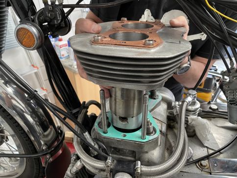 10.06.2022 - Ich mache mir Gedanken darüber, wie man mit dem Bohrer am Rahmenrohr vorbei kommt - da ist sehr wenig Platz. Ein kleines Bohr- futter aus dem Baumarkt ist auch nicht schmal genug, ebenso eine biegsame Welle. Abends kommt mir die Idee: Aus einem Stück Alu drehe ich mir eine Art Spannhülse für den Bohrer, damit ist er lang genug, dass ich über dem Rahmenrohr bleibe. Am Vormittag kommt Dieter zur Unterstützung, wir bohren die Kernlöcher für das Gewinde, wobei sich herausstellt, dass die Löcher keine Sacklöcher sind, sondern im oberen Teil des Zylinderkopfes enden - was für ein Blödsinn! Jetzt müssen wir die Ventildeckel wieder abbauen (wobei die neuen Korkdichtungen zum Teufel gehen) und die Späne mit einem an den Staubsauger angeschlossenen Minischlauch entfernen. Dann werden die Gewinde für die Einsätze geschnitten und diese eingesetzt. Aus 2 5/16" BSF Schrauben werden zwei Stehbolzen angefertigt, dann kann die Motorhalterung wieder montiert werden. Dann setzen wir den Tank auf, füllen 2 Liter Benzin ein und versuchen unser Glück: Nach 2 Tritten erwacht der Twin zum (B)Leben! Ich lasse den Motor bei niedrigen Drehzahlen etwas warmlaufen, damit sich die Kolbenringe einlaufen können. Dann wird eine Proberunde gedreht, bis das Öl warm ist - Ölwechsel mit Filter ist angesagt. Der ist wie üblich zeitraubend, da der Ölkühler leerlaufen muß und beim Wechsel des Filters im "Dom" das Öl über den ganzen Motorblock quillt, aber schließlich ist auch das geschafft, die Enfield darf nach einem Jahr endlich wieder ihren angestammten Platz in der Garage einnehmen!