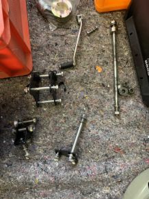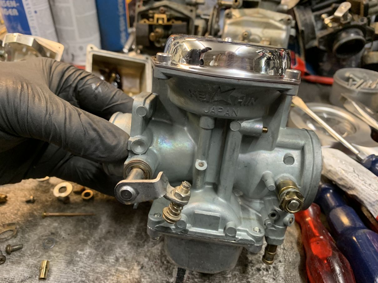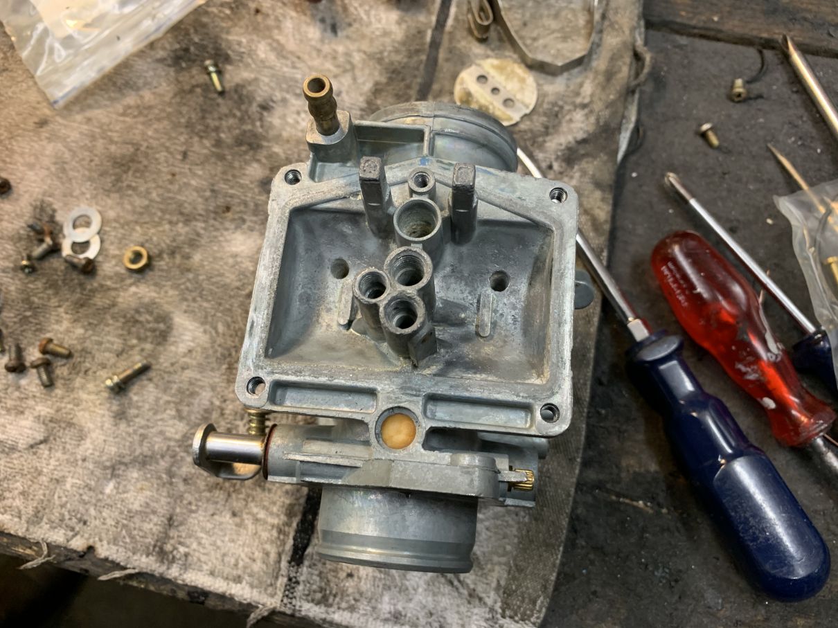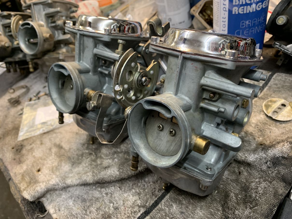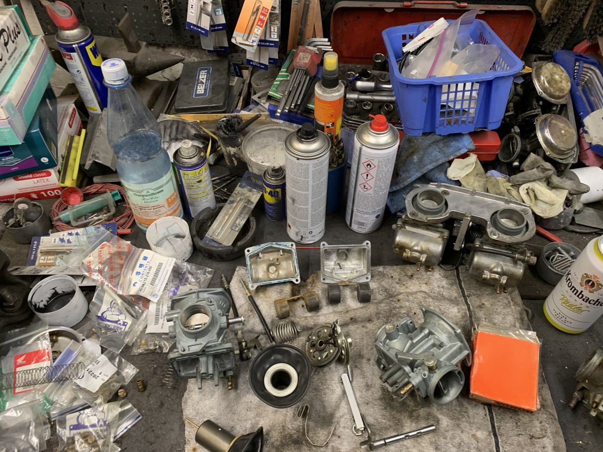 26.12.2020 - Gestern haben wir uns eine Auszeit gegönnt, aber heute geht es weiter. Der zweite Vergaser wird zusammen gesetzt, diesmal geht es bedeutend schneller, da wir nun die Einzelteile gut kennen. Trotz insgesamt 8 Vergasern, die uns zur Verfügung stehen, mangelt es immer wieder an den gleichen Teilen, wir müssen ordentlich räubern. Egal, schließlich ist der 2. Vergaser fertig, nun müssen die beiden auf die Vergaserbrücke gesetzt und gekoppelt werden. Das klappt, aber nachdem die Drosselklappen verbunden sind, gehen sie so schwer, dass sie klemmen, woran liegt's? Solange die Vergaser noch "solo" waren, lief alles leicht, demnach muß die Koppelung verbogen sein. Wir klopfen und biegen mit einem Schraubenzieher dran herum, bis es wieder besser wird, das war's. Die Vergaser sind bereit, wir räumen noch die ganzen Überbeibsel zusammen und beenden den Arbeitstag.