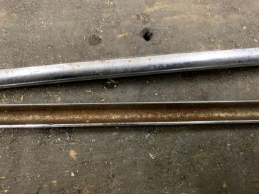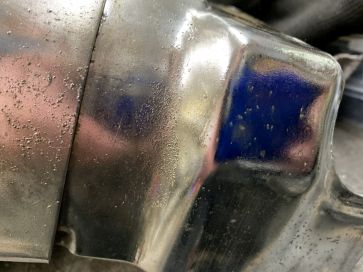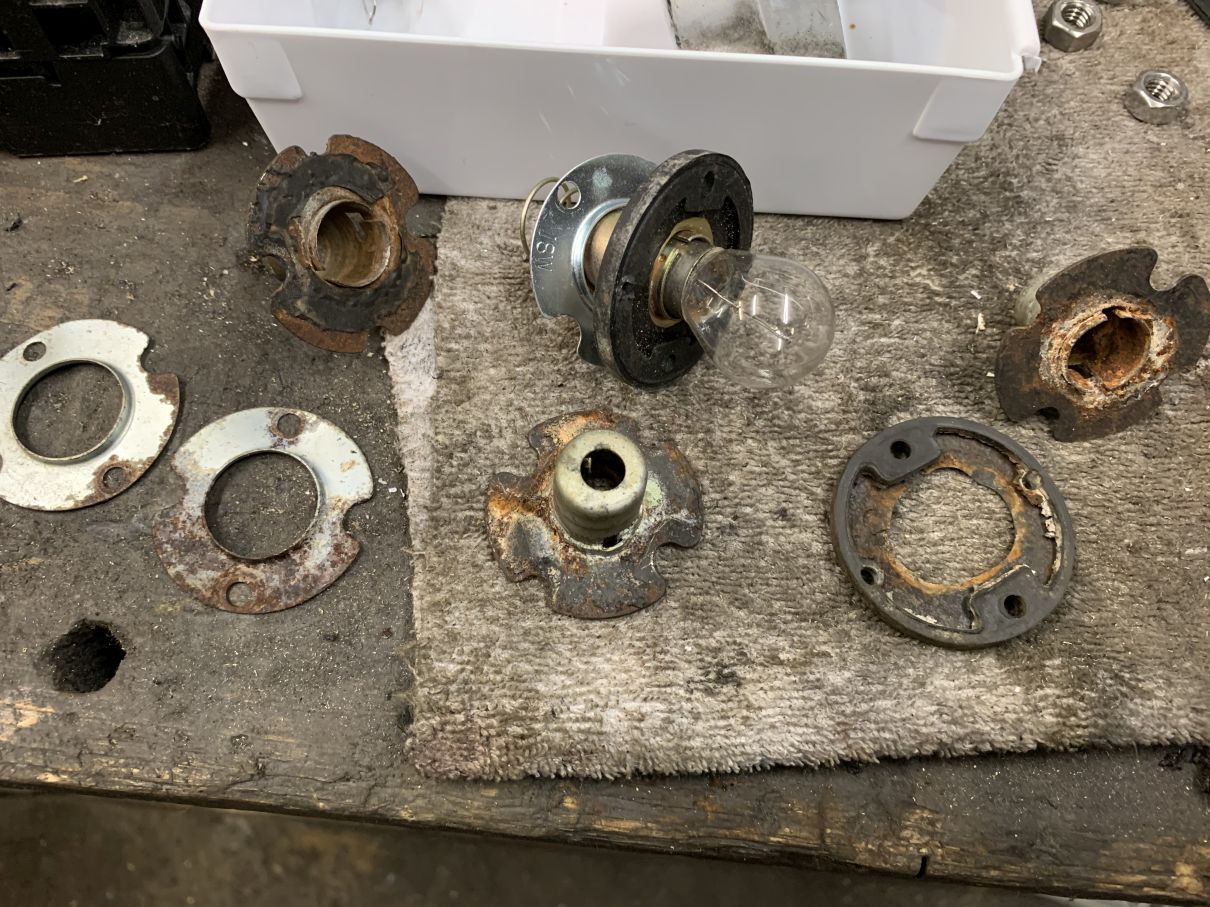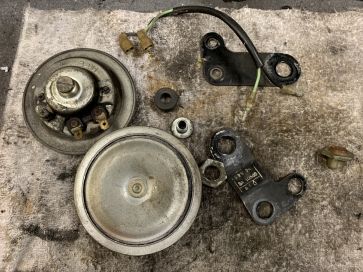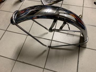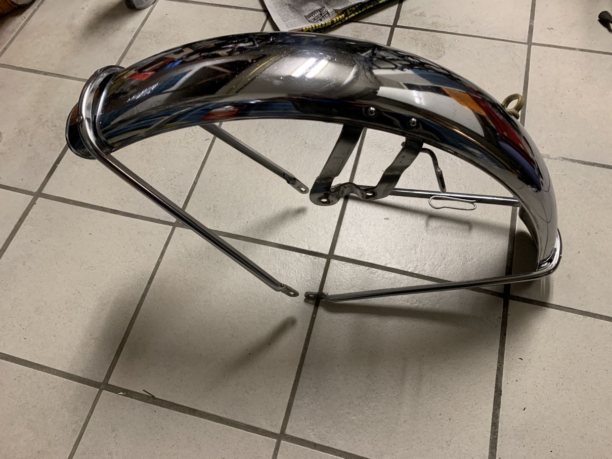 13.04.2020 - Ich nehme mir die Hupe vor, dir wir, mitsamt reichlich anderen Gebrauchtteilen, von einem netten Enthusiasten (Hallo, Marc) ergattert haben. Es zeigt sich jedoch, dass die Hupe elektrisch "tot" ist... Nach langem Suchen finde ich noch ein Exemplar in meinem Fundus - auch "tot". Was nun? Bei eBay werde ich erst fündig, als ich die Suche erweitere: Ein Exemplar einer deutlich jüngeren CB250N taucht auf, dass identisch zu sein scheint und laut Anzeige auch funktioniert - her damit! Was jetzt? Der Hupenhalter ist noch relativ gut, ein paar Ecken werden entrostet und beigepinselt, aber es fehlt eine der Gummibuchsen nebst Metallhülse. Kürzlich habe ich Kabel- führungssortimente aus Gummi erworben, eine Größe passt vom Außen- durchmesser in den Halter. Mit einer Feile wird der etwas zu kleine Innen- durchmesser auf das richtige Maß gebracht, dazu werden auf der Drehbank aus VA zwei neue Stützhülsen hergestellt. Bis die fertig sind, sind meine Lackreparaturen trocken, der Halter ist damit montagefertig. Als nächstes nehme ich mir den vorderen Kotflügel vor, die Haltebügel müssen wieder montiert werden. Aber wo habe ich die Abstandsstücke aus Kunststoff bloß hingelegt? Erst nach einer halben Stunde Suche finde ich sie wieder, seltsamerweise im Sortimentskasten mit den Blinkern. Zum Glück hatte ich für die Restaurierung der anderen CB250 bereits neue Schrauben für die Haltebügel in ausreichender Zahl erworben, in der Garage finden sich daher passende M5 Senkkopfschrauben mit Kreuzschlitz in VA. Die Bügel werden montiert, der fertige Kotflügel wandert in die Garage. Es folgt der hintere Kotflügel: Zuerst versuche ich mit Chrompolitur und einer Edelstahlürste im Minischleifer soviel wie möglich vom Chrom der Aussenseite zu retten, dann wird die Innenseite zuerst mit einer groben Zopfbürste vom losen Rost befreit, dann das gesäuberte Blech mit Rost- umwandler eingepinselt - für heute ist's genug.