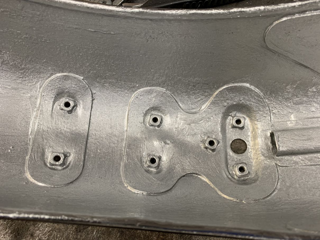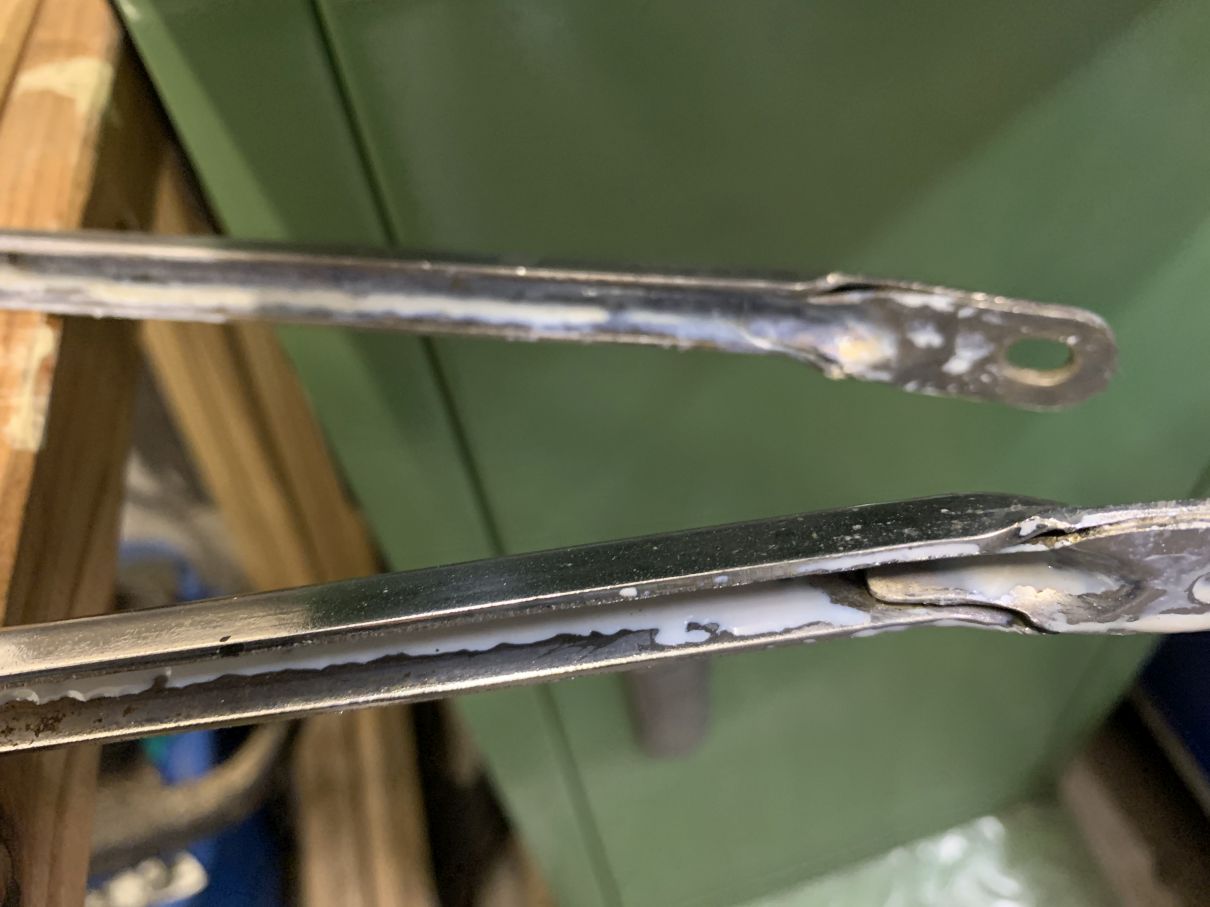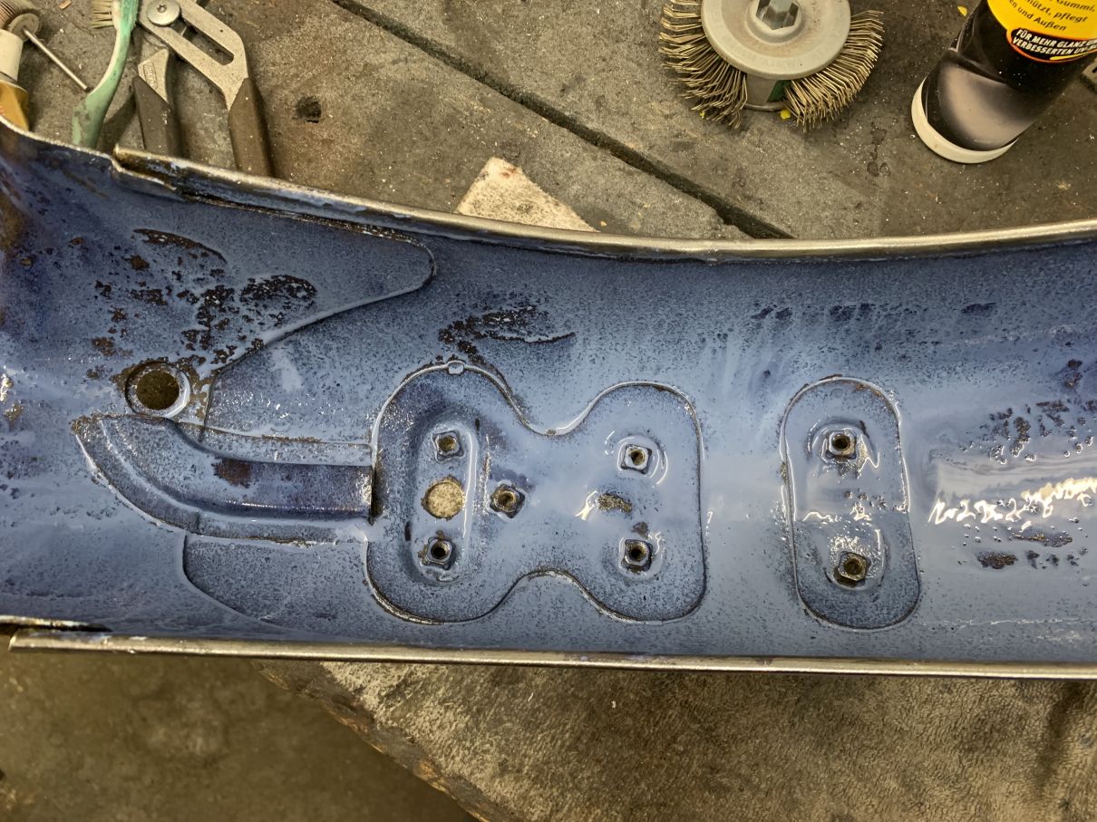 02.04.2020 - Zeit genug für eine Kleinigkeit: Die Haltebügel des vorderen Kotflügels sehen mich schon eine Weile ganz traurig an... Der Rostumwandler hatte genügend Zeit, die Innenseite zu bearbeiten, es fehlt noch ein Anstrich mit Silberlack, das hole ich jetzt nach. Morgen gibt's noch eine 2. Schicht, dann kann der Kotflügel komplettiert werden.
