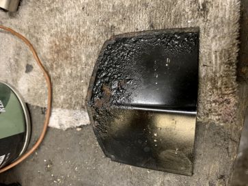 14.04.2020 - Vor dem Frühstück kurz nach dem Kotflügel gesehen: der Rostumwandler hat sein Werk getan, die Innenseite ist trocken. Schnell eine Schicht Silberlack drauf, bis zum Abend kann das trocknen. Abends ist die Farbe aber nicht ganz trocken, ich helfe mit dem Heißluftfön nach. Dann folgt eine 2. Schicht Lack, damit ist die kleine Farbdose auch endgültig leer. Ich suche noch nach dem originalen Halter für den Rückstrahler, der von meiner letzten CB übrig geblieben ist und finde ihn in einer Wühlkiste. Soll ich den versuchen zu retten oder doch ein Teil aus VA nachbauen?